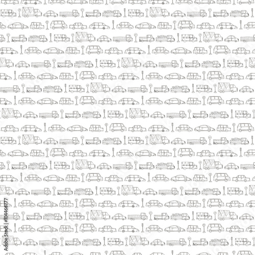 Cartoon hand drawing cars with traffic lights and road signs seamless pattern background. Coloring book