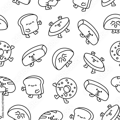 Cartoon happy bread face characters. Seamless pattern. Coloring Page. Funny tasty bakery pastries. Hand drawn style. Vector drawing. Design ornaments.