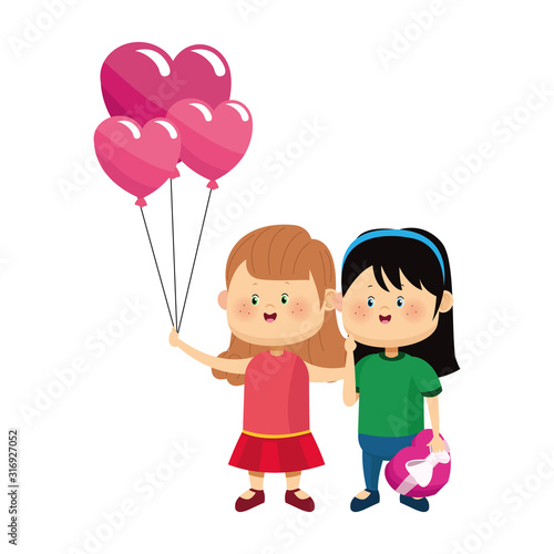 cartoon happy girls with hearts balloons and chocolate box, colorful design