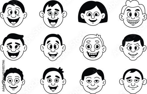 Cartoon head icons collection depicting various smiling faces and diverse expressions for graphic design