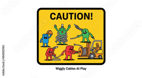 Cartoon Illustrated Caution Sign Depicts Whimsical Cable-Handling Scene Funny.