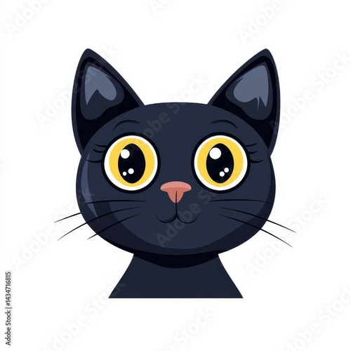 Cartoon illustration of a black cat with yellow eyes and a pink nose smiling