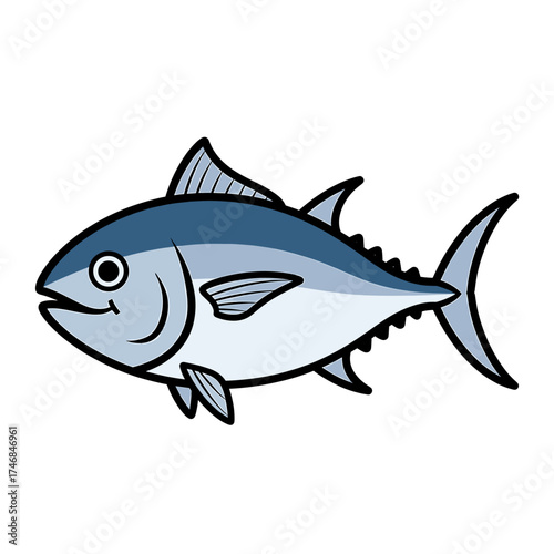 Cartoon illustration of a blue tuna fish with a smiling face, swimming to the left, isolated on white.