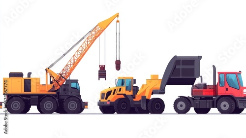 Cartoon illustration of a crane, front loader, and truck on a white background