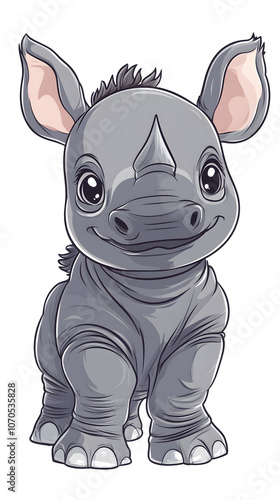 Cartoon illustration of a cute rhino character in a playful, wildlife-themed setting with other animals