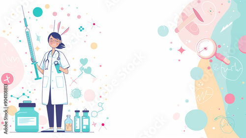 Cartoon illustration of a female doctor holding medical equipment with a cheerful expression