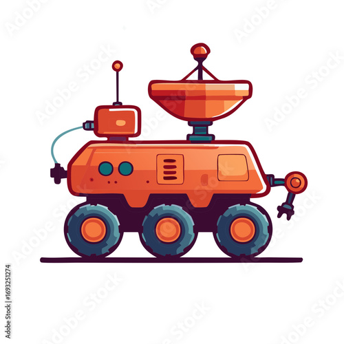 Cartoon illustration of a futuristic space rover with antenna and radar