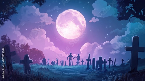 Cartoon illustration of a graveyard with tombstones under a full moon at night. Two skeletons walk hand in hand through the cemetery. Halloween concept.