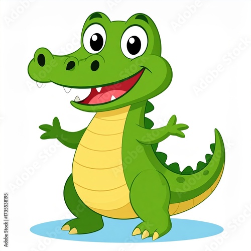 Cartoon illustration of a smiling green crocodile with arms outstretched, standing on a light blue surface.