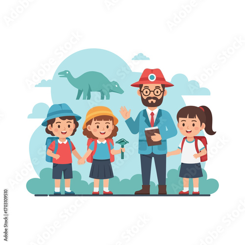 Cartoon illustration of a teacher with three students in front of a dinosaur display, likely on a school trip.