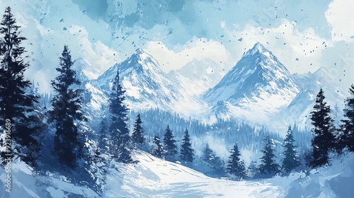 cartoon illustration snowy mountain landscape pine trees design splash loosely cropped princess banner holiday vibe grass russia