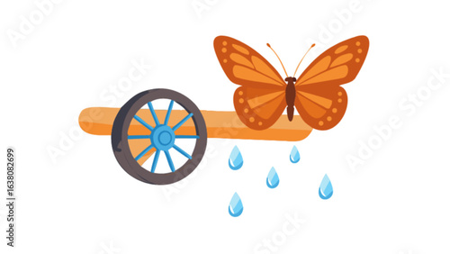 Cartoon image of a butterfly perched on a cart with a wheel and some water droplets falling down