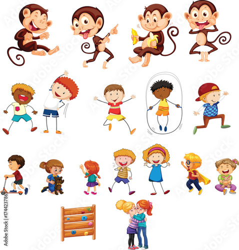 Cartoon Kids and Monkeys Playing Fun Children Illustration Set