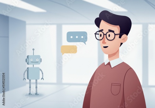 Cartoon man and robot with speech bubbles in an office setting, illustrating ai communication