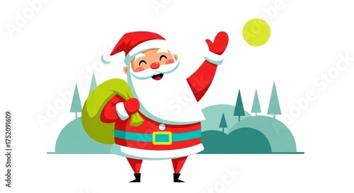 Cartoon man Santa Claus waving a hand and holding a green sack of gift in a retro style. Christmas winter holiday festive greeting.