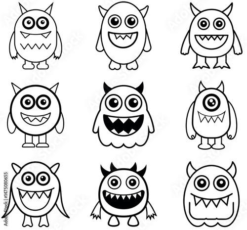 Cartoon Monster Character Set Cute, Black and White Illustrations