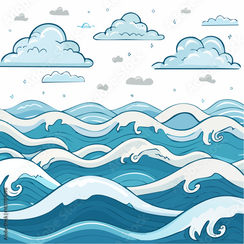 Cartoon Ocean Scene: Tranquil Waves Under a Cloudy Sky in a Whimsical Illustration