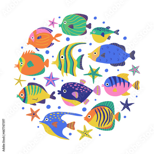 Cartoon ocean underwater animals, fishes, starfishes. Marine life background. Ocean wild life round composition. Hand drawn vector illustration isolated on white background.