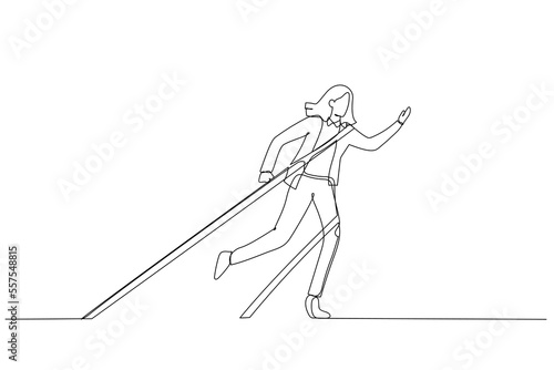 Cartoon of business woman tied up with tape rope try to escape concept of business difficulty. Single line art style