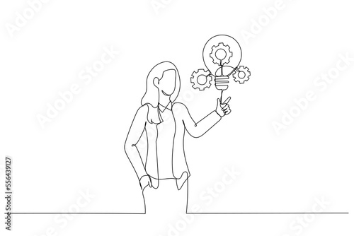 Cartoon of businesswoman presenting innovative lightbulb with cogs and gears concept of Innovation. Single continuous line art style