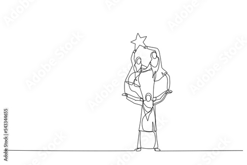Cartoon of muslim woman help and support his team can climb up and reach the star. Single line art style