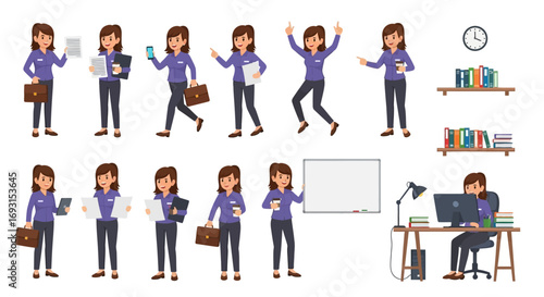 Cartoon office worker character constructor vector illustration. A businesswoman wearing a purple shirt and trousers holds a briefcase, documents, a smartphone, and a coffee cup.