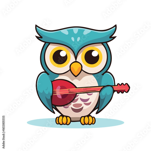 Cartoon owl with blue feathers and a red musical instrument, playing music.