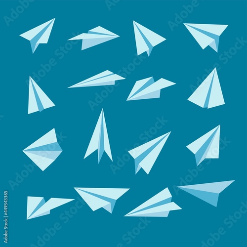 Cartoon paper plane vector illustrations set. Collection of white paper airplanes flying in air or sky, aircraft from folded paper isolated on blue background. Origami, communication, freedom concept