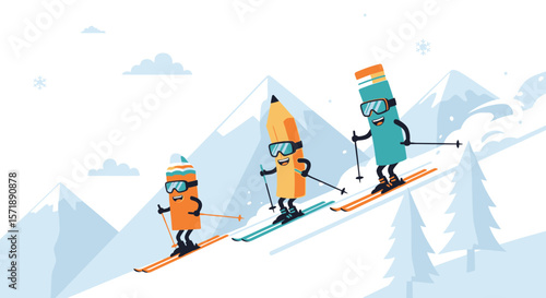 Cartoon Pencils Enjoying Winter Skiing Adventure In Snowy Mountains Scenery