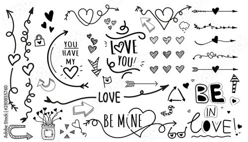 Cartoon pictures set of different hand drawn arrows and love details. Mixed style white and black flat icons. Vector illustration. White background
