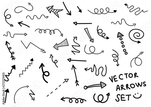 Cartoon pictures set of different hand drawn arrows. Mixed style white and black flat icons. Vector illustration. White background.