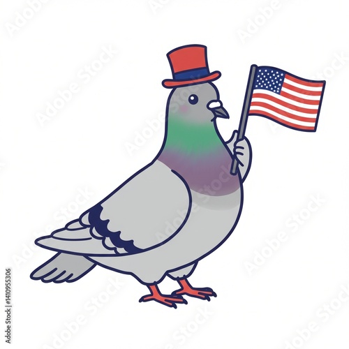 Cartoon pigeon wearing a top hat, holding an American flag, celebrating patriotism outdoors - patriots clipart | patriotic clip art