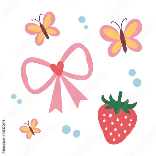 Cartoon pink bow with strawberry. butterflies, illustrations.