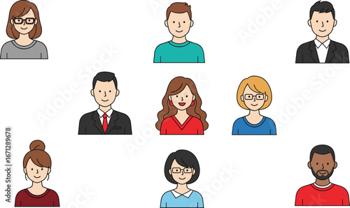 Cartoon portraits of diverse people in 3x3 grid, vector characters with different styles, outfits, professions, community, diversity concept