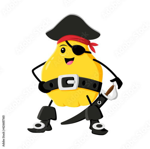 Cartoon quince fruit pirate and corsair character with saber. Vector happy smiling buccaneer in captain cocked hat and eye patch. Isolated freebooter or picaroon book or game personage with sword