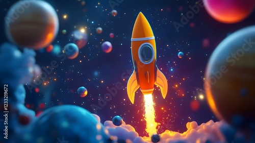 Cartoon Rocket in 4D Space with Glowing Celestial Bodies, Playful Sci-Fi Art for Children's Books or Animations