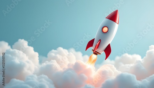 Cartoon Rocket Launching Through Fluffy Clouds Against a Light Blue Sky