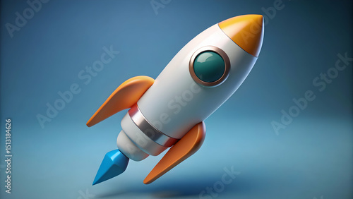 Cartoon rocket ship on a blue background with orange fins and a yellow nose cone in a studio shot