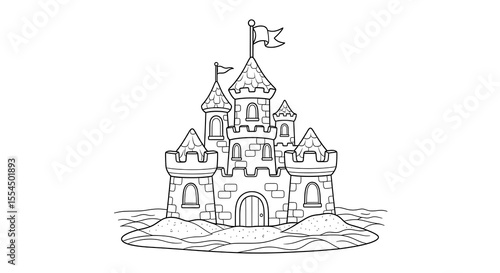 Cartoon sandcastle with flags and windows isolated on transparent background