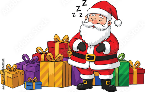 Cartoon Santa Claus sleeping with colorful wrapped gift boxes, festive Christmas holiday illustration, humorous seasonal design with ribbons, bows, cheerful presents
