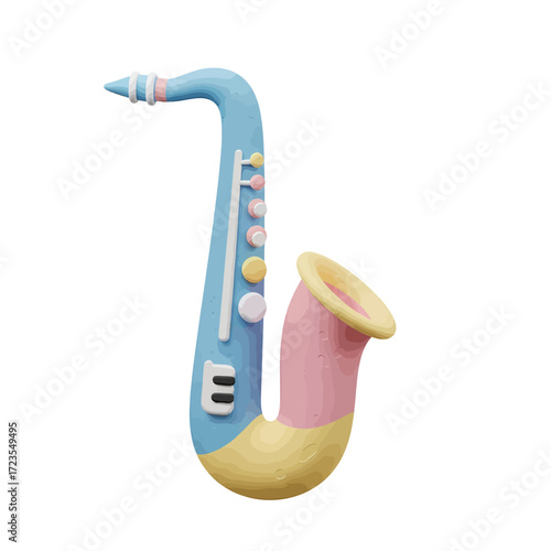Cartoon saxophone stands upright, rendered in soft pastel colors against a white backdrop, creating a whimsical and playful musical instrument representation.