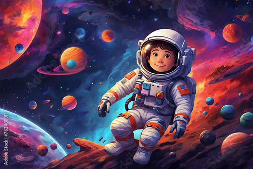 Cartoon scene with astronaut in outer space illustration for creative graphic design