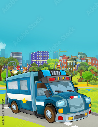 cartoon scene with police car vehicle on the road - illustration for children