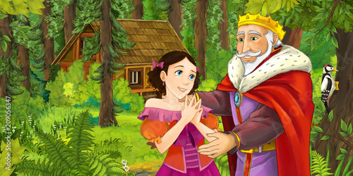 cartoon scene with prince and princess or king and queen resting during traveling and encountering hidden wooden house in the forest - illustration for children