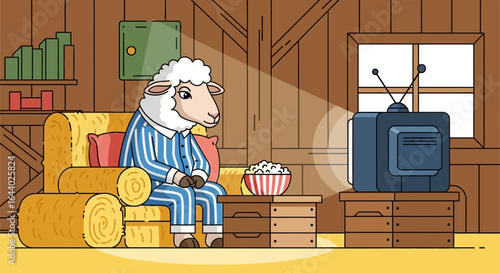 Cartoon Sheep In Pajamas Watching Television With Popcorn At A Barn