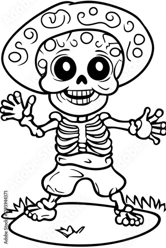 Cartoon Skeleton Standing and Waving with Hat Line Art