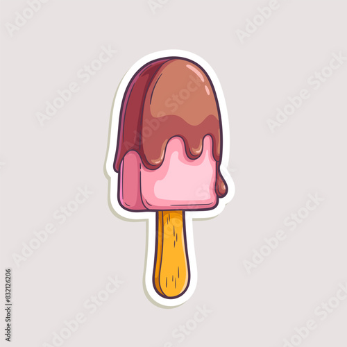 Cartoon sticker for summer design. Vector hand-drawn illustration of ice cream on a stick isolated on white.