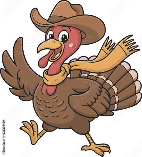 Cartoon Turkey with Cowboy Hat and Scarf Vector Illustration Autumn Harvest Season