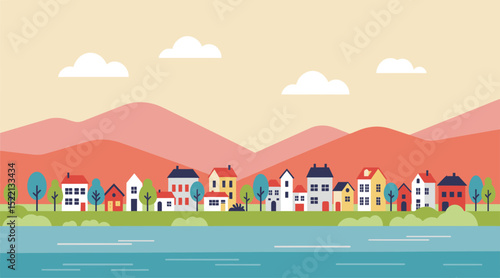 Cartoon vector illustration of a summer mountain landscape with a rural village and trees under a cloudy sky