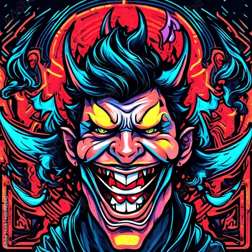 cartoon vector style t-shirt art of a devil laughing, bright neon colors